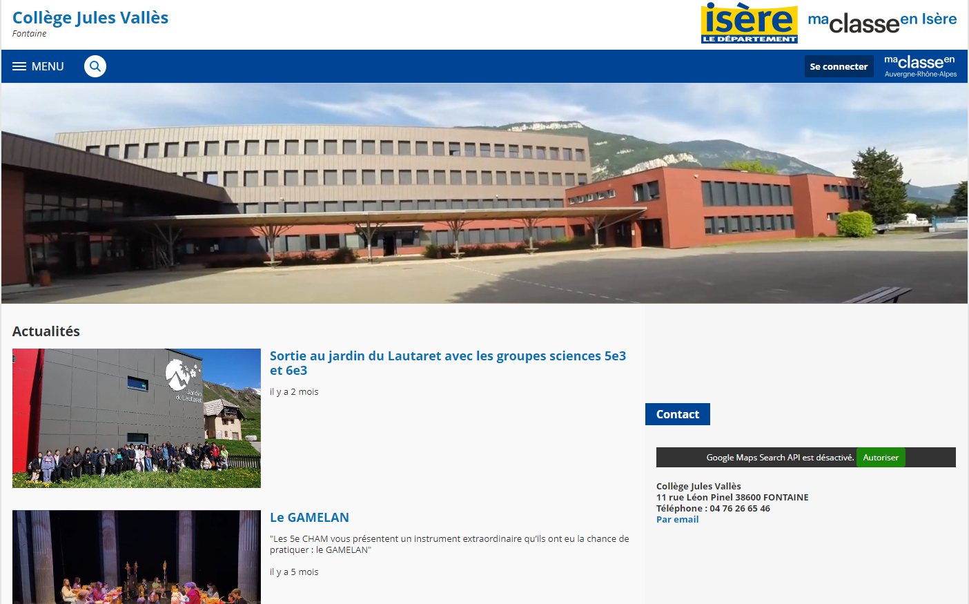 La page d’accueil s’affiche (voir image 1 ci-dessus) avec les articles classés par rubriques ainsi qu’un accès à Pronote qui permet de consulter les emplois du temps, résultats, bulletins, absences des élèves.